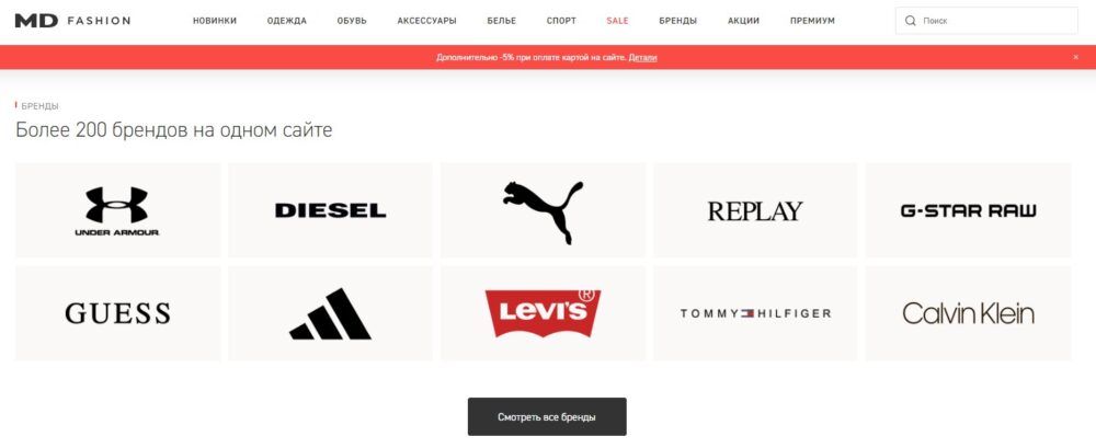 MD Fashion — официальный партнер и дистрибьютор в Украине всех представленных на сайте брендов. А их более 200, вы только представьте! Tommy Hilfiger, Calvin Klein, Gant, Diesel, Replay, Under Armour и многие другие покорят вас своими предложениями, фирменными технологиями и неподдельным качеством. С таким ассортиментом вы каждый день сможете создавать новые эффектные образы в различных стилях: от спортивного до романтического, от делового до кэжуал, от стритстайла до рок-шика.