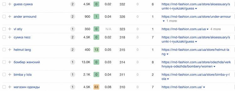 Вот пример ключевых слов, по которым ранжируется магазин MD Fashion: