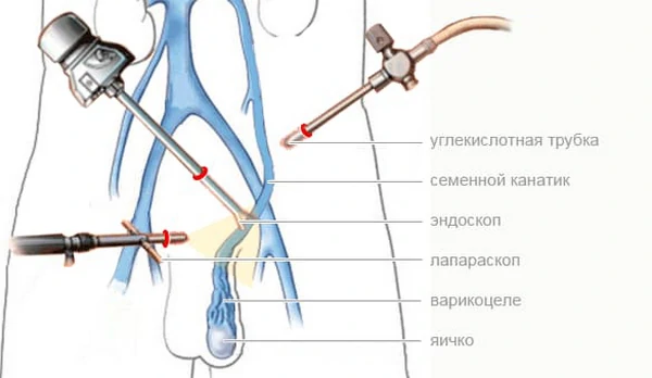 Через 2–3 маленьких прокола вводят камеру и инструменты, находят вены и выключают их из кровотока. Метод удобен при двустороннем варикоцеле.