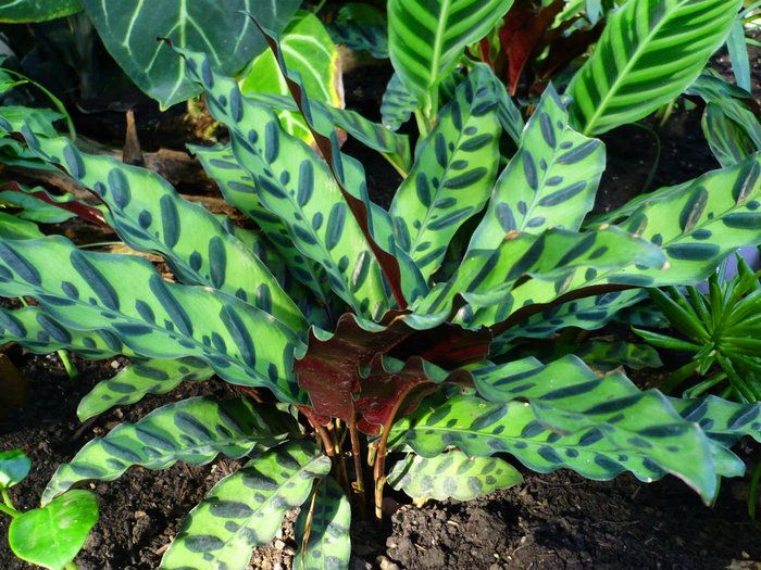 - Калатея украшенная — сверху на листьях розовые полоски, постепенно бледнеющие, с внутренней стороны лист пурпурный.
