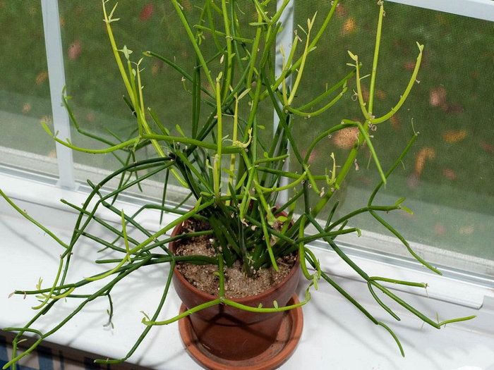 Это древовидное растение семейства молочайные. Вечнозеленое суккулентное растение с причудливыми изогнутыми голыми ветвями, цветет маленькими зеленовато-желтыми цветочками. Как и все молочайные, является обладателем ядовитого сока, способного вызвать легкий ожог или аллергическую реакцию.